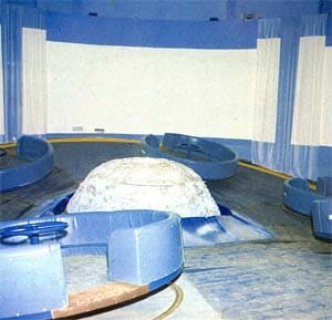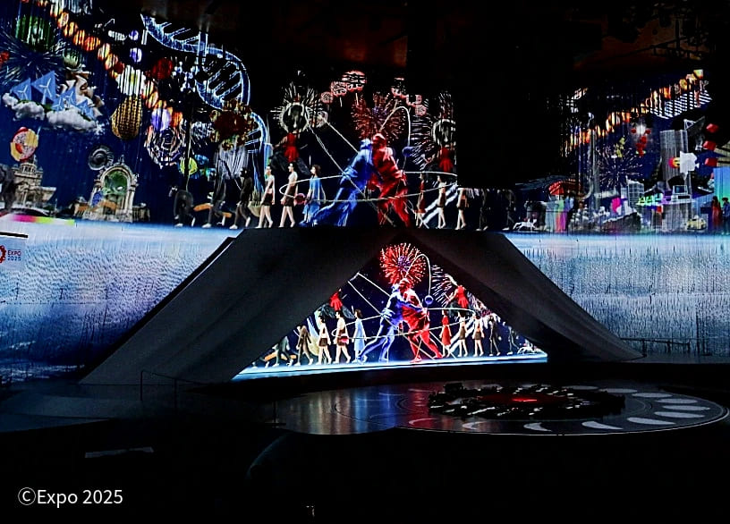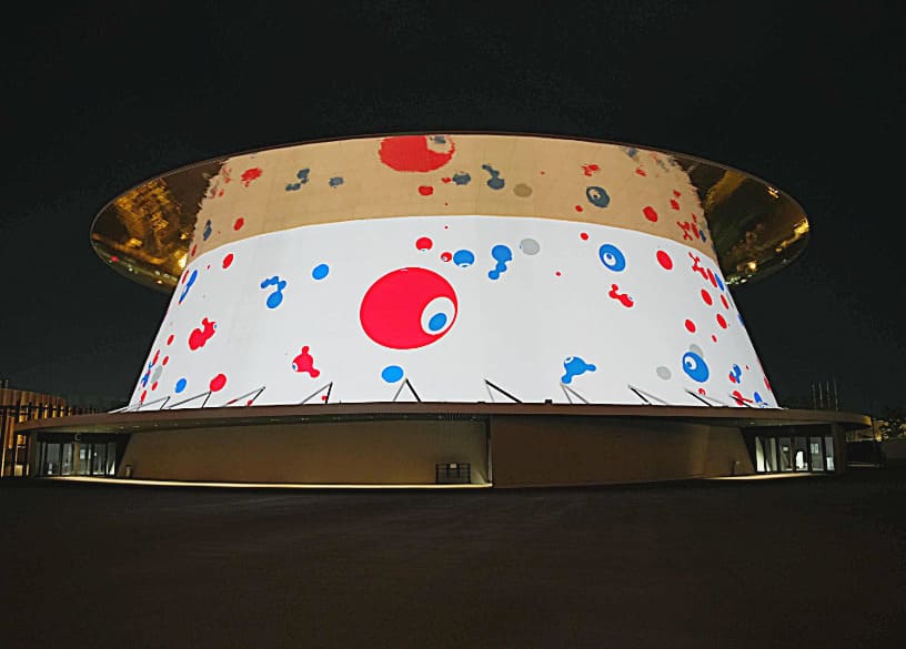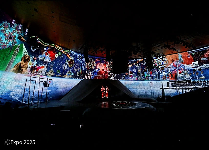 当社とテルミック社が協働でEXPO ホール「シャインハット」に吊物機構および映像装置を納入しました。EXPO ホールは、約1,900席を備えた円形劇場で、開閉会式や音楽、演劇、フォーラムなど多目的に活用されました。鉄骨造の2階建て構造であり、床面積は8203.91㎡、円形ステージ直径は18m、ホール内360°のプロジェクションマッピングが可能。デザインは1970年の大阪万博の「太陽の塔」を連想させるもので、黄金の大屋根と荒々しい壁 面が特徴です。客席と舞台が一体となった円形劇場は、「いのち輝く未来」を象徴する祝祭空間を創り出しました。